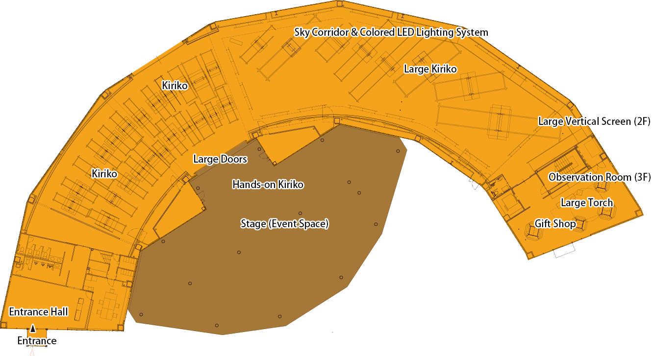 The reception desk, Kiriko exhibition, and gift shop are located on the first floor. The Kiriko exhibition space features seven large Kiriko and 24 others on display. The gift shop offers a variety of unique souvenirs.